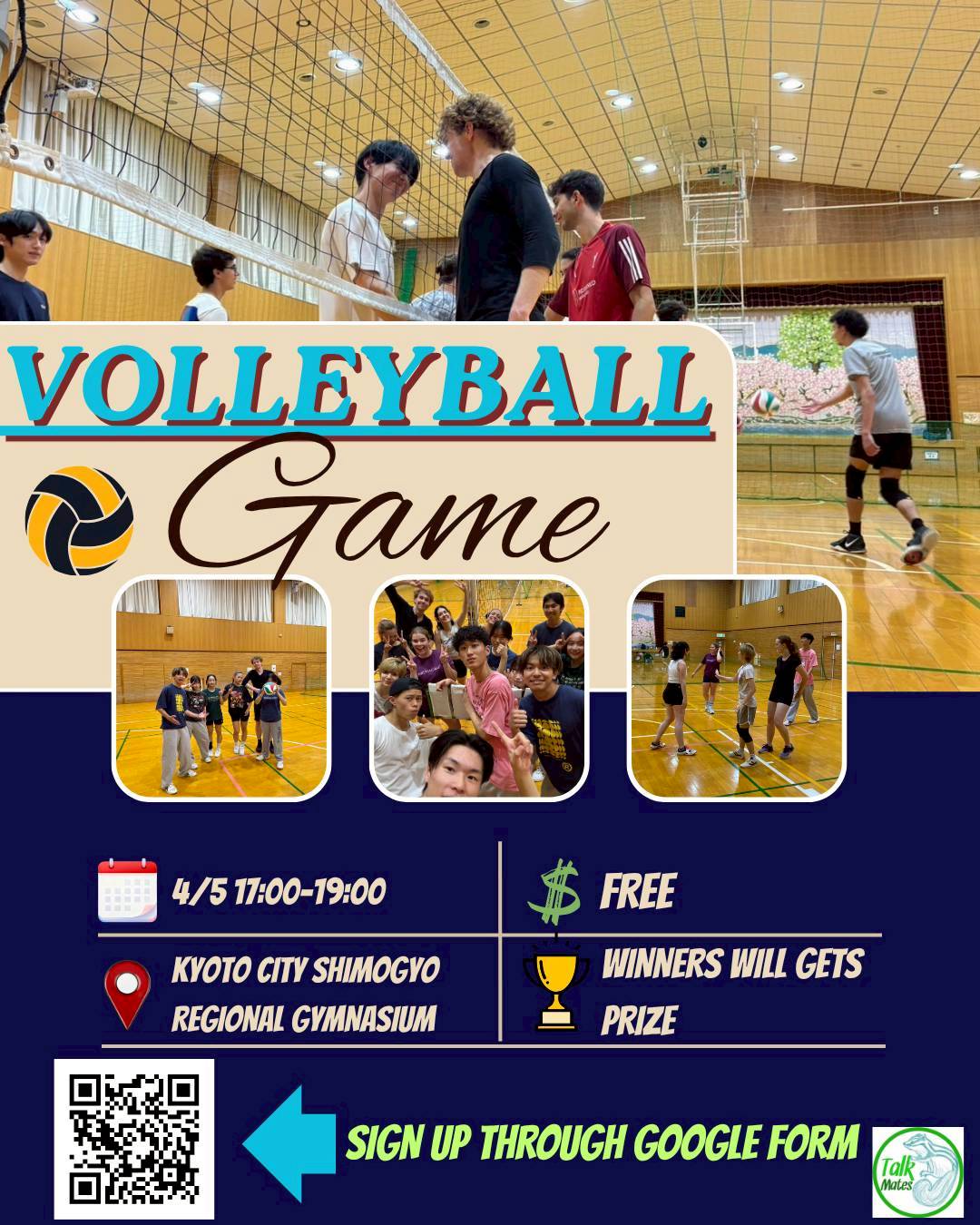 4/16(木) 17:00-19:00:バレーボール(下京地域体育館)